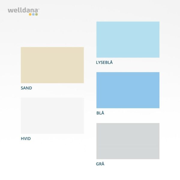 - Standard farver: blå, hvid og sand.