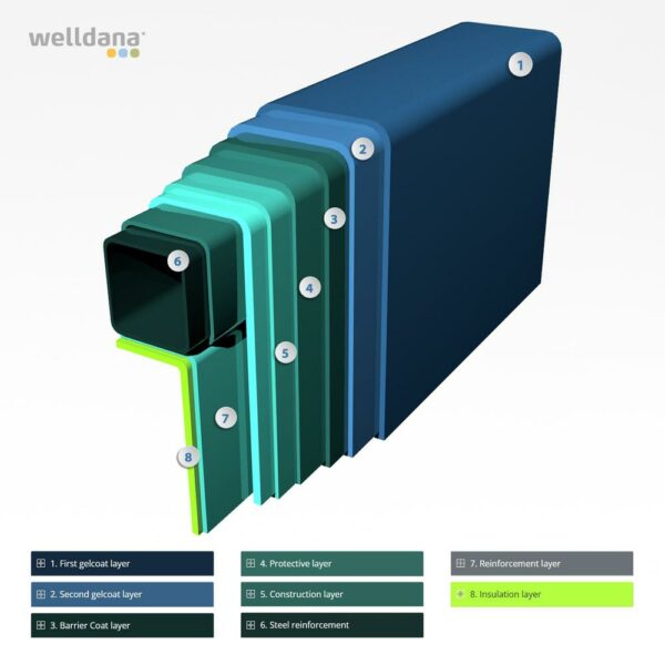 Welldana® Fiberpool model Athen, en høj kvalitets flot pool fremstillet i 3 lags glasfiberarmeret polyester, forstærket med gelcoatet vinylester og keramisk belægning. Overfladen er sprøjtemalet med en meget miljøvenlig, UV hæmmende og stærk kvalitets maling, for super flot finish. Leveres standard isoleret med ca. 20mm påsprøjtet polyurethan isolering. Monteres nedgravet på fast underlag med støbte sider.
