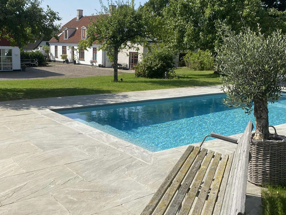 En Central-pool giver et minimalistisk og eksklusivt udtryk. Du har mulighed for at lægge belægningen omkring poolen helt op til kanten for at flot og stilrent udseende.